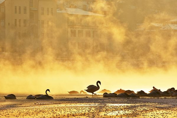 在迷雾缭绕的清晨,天鹅在布拉格的伏尔塔瓦河上舞蹈。