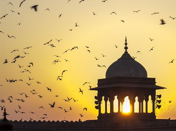 清晨的贾玛清真寺,这个圆顶的小亭子赋予了初升的太阳一个完美的轮廓。