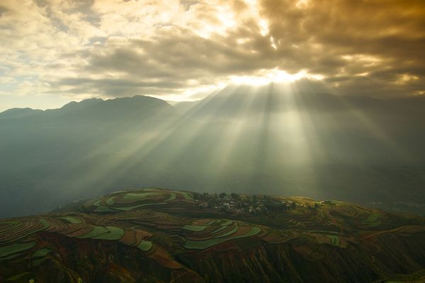在这个角度可以看到太阳光芒照射下的整个梯田。