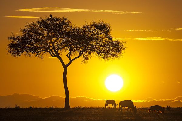 日出时分的马赛马拉国家保护区,阳光照着高大的金合欢树和低头吃草的牛羚。