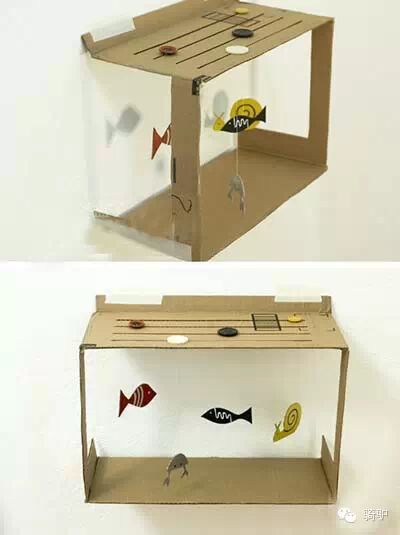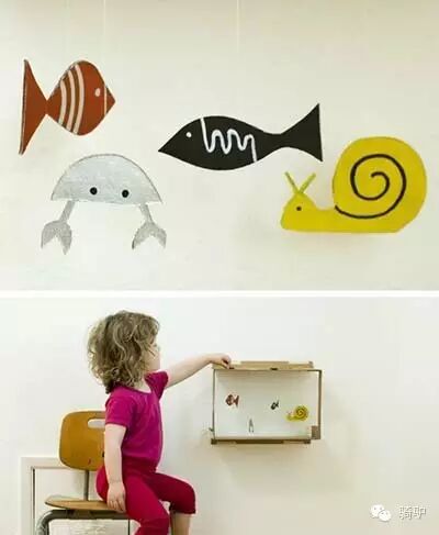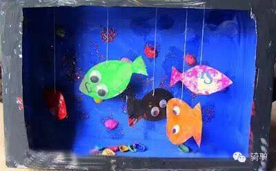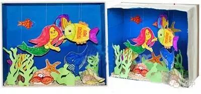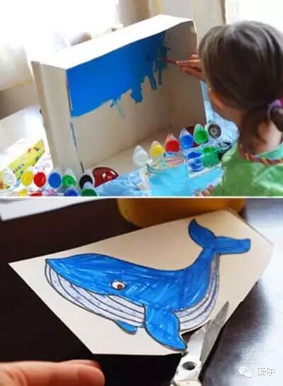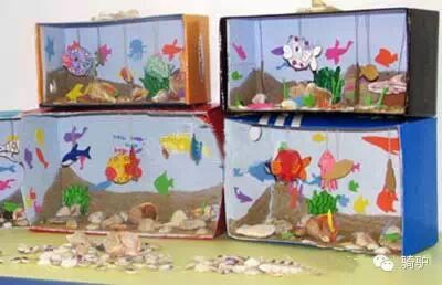 把鞋盒内部刷成蓝色,将孩子画笔下的各种形象剪下来,美丽的海底世界出炉。你可以用这样的方法创建更多的场景!