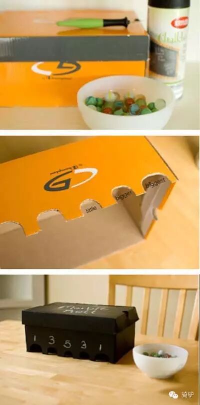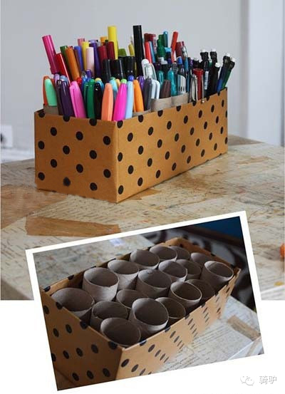 收纳笔筒:有孩子的家庭一定知道,孩子们用的笔可谓种类繁多,这个用鞋盒及各种卫生纸芯组合成的收纳装置可以清楚地将彩色水笔、蜡笔、铅笔等零碎进行分类,一目了然,简单实用哦。