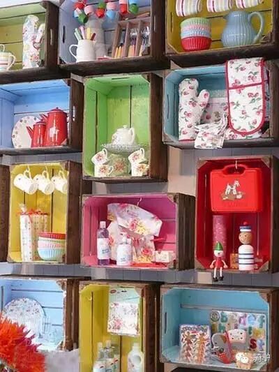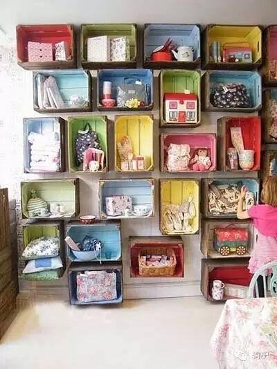 收纳展示架:将高高低低的鞋盒挂在墙上,这是绝好的展示陈列架,分类收纳孩子的各种物品,一目了然。
