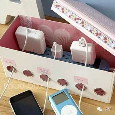 电线收纳盒:这是一个非常巧妙的方法,将插座放入鞋盒内,既使各种凌乱的线也能保证总体视觉上的美观和清洁。