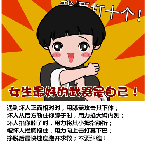 必转丨妹纸必备防狼手册! 0 News Update, 揭开女人的秘密, 生活趣味 12:55 A+ A- Print Email 近日,多起女生出门被害案件:重庆女大学生遭黑车司机杀害,女大学生济南搭黑车遭性侵,江苏女大学生回家途中遭劫杀......!妹纸们,出门一定要留个心眼,千万别心存侥幸,单独行动一定要提高警惕!就算是女汉子,也要懂得这些↓ 请转给你身边的女生朋友。
