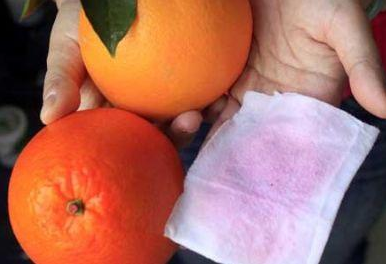 市场上的橙子颜色格外艳丽,惹得不少人直流口水。当你遇到这样的橙子时,可要小心了,它有可能是被染过色的橙子。有些商贩为了让橙子色泽更漂亮、卖相更好,就把色素注射到橙子皮里,再在皮上打些石蜡,使橙子看起来很新鲜,但这样的橙子会掉色。还有商家甚至把长有霉斑的橙子清洗干净、晾干,然后用石蜡给橙子打蜡上色。这样,原本长了霉斑、灰头土脸的橙子转眼间变得又红又亮。