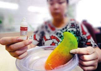 由于荔枝保存时间短,商贩往往会买来色青半熟甚至是生荔枝,用稀释过的盐酸浸泡,或把稀盐酸喷洒在荔枝表面,未熟的荔枝表皮就会变得红嫩、新鲜,宛若刚刚采摘下来的鲜荔枝,但很容易腐坏。这类溶液酸性较强,会使手脱皮、嘴起泡,还会烧伤肠胃。还有果贩会用硫磺熏制,而二氧化硫对眼睛、喉咙会产生强烈刺激,导致人头昏、腹痛、腹泻,严重者甚至还会致癌。